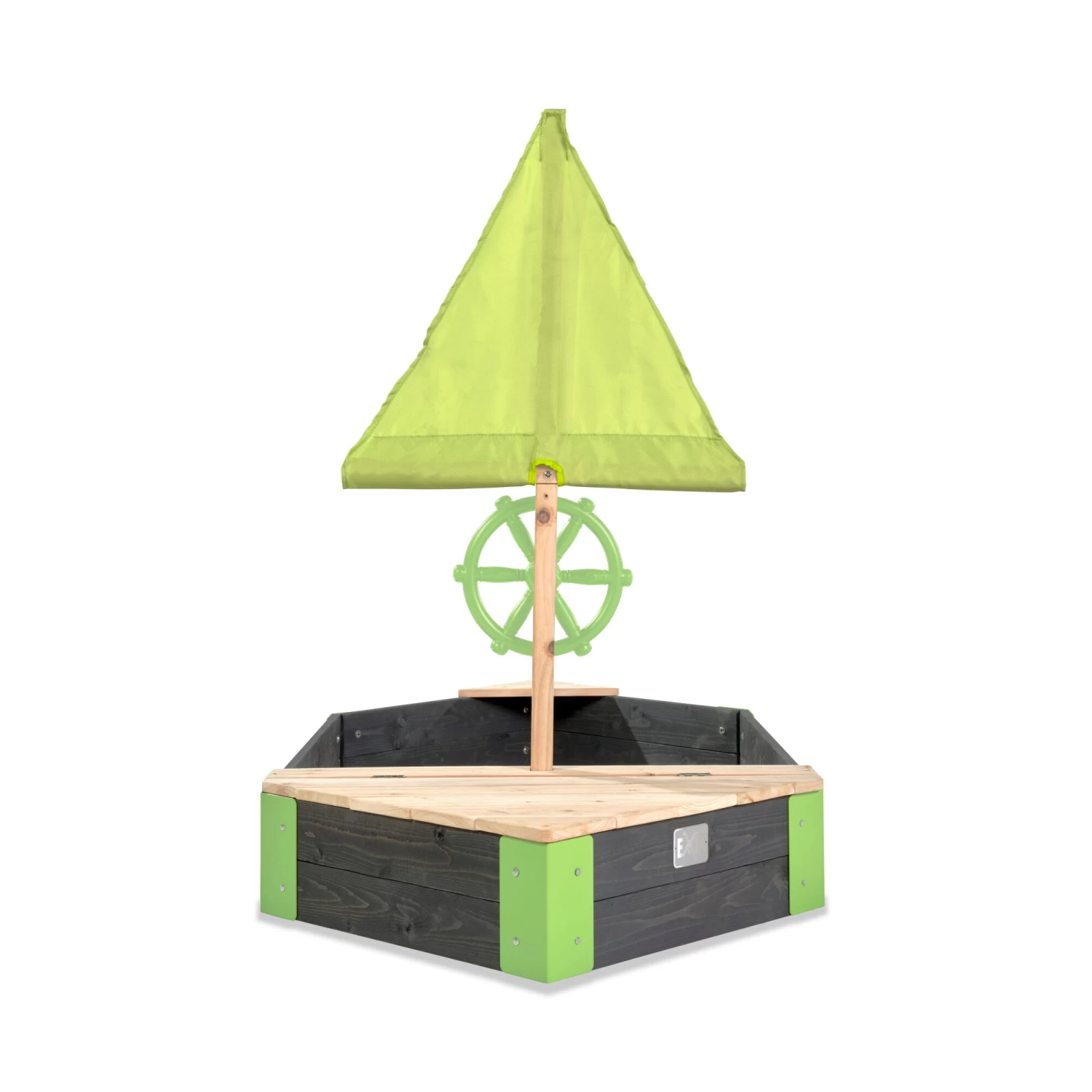 In de EXIT houten zandbak in de vorm van een boot voelen kinderen zich een echte kapitein of matroos. De zandbak is met een draaiend stuurwiel, mast en verborgen opbergruimte van alle speelaccessoires voorzien. Dus kijk of alle vriendjes en vriendinnetjes aan boord zijn, hijs de zeilen en stuur in de juiste richting. Is het eindelijk rustig op zee? Dan is het tijd om het speelgoed uit de opbergruimte te pakken en zandtaartjes voor de bemanning te maken. Schip Ahoy maatjes!