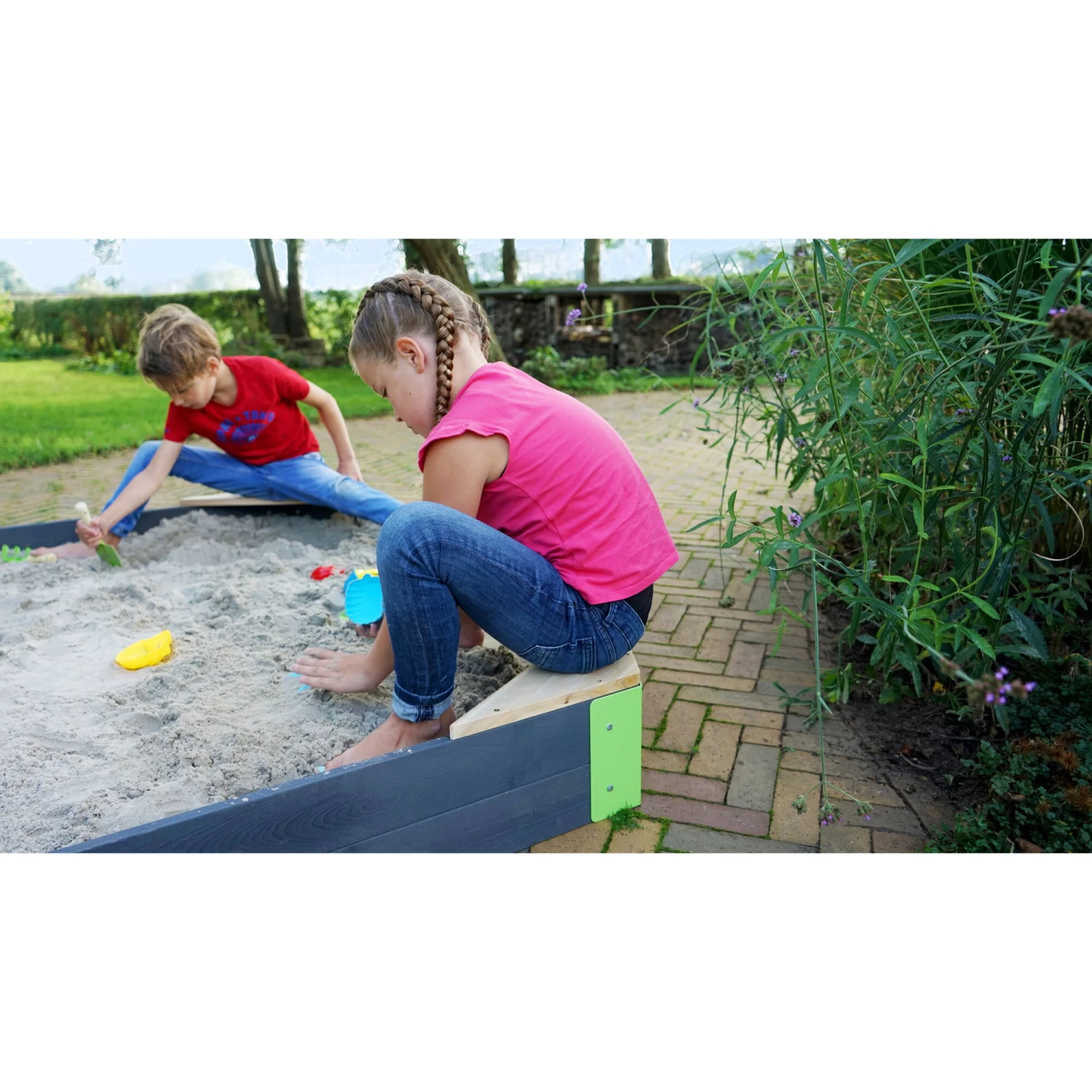 De Aksent houten zandbakken van EXIT Toys zijn eenvoudig te monteren en super stevig. De voorgeboorde planken worden in de hoeken bevestigd aan metalen koppelstukken, waardoor de zandbak stabiel staat. De hoeken hebben een opvallend groene kleur en dit in combinatie met het grijskleurige hout geeft de zandbakken een moderne uitstraling.