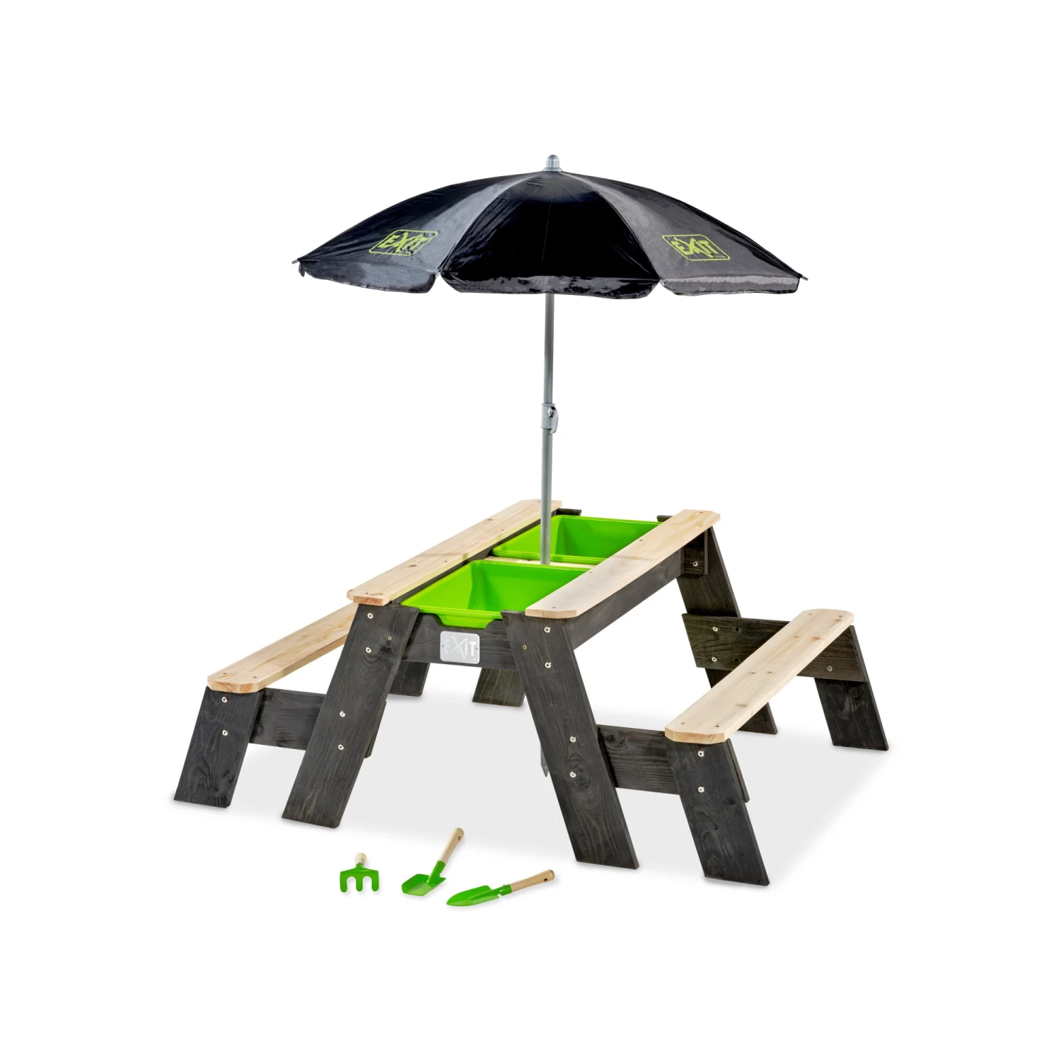 EXIT Aksent zand-, water- en picknicktafel (2 bankjes) met parasol en tuingereedschap