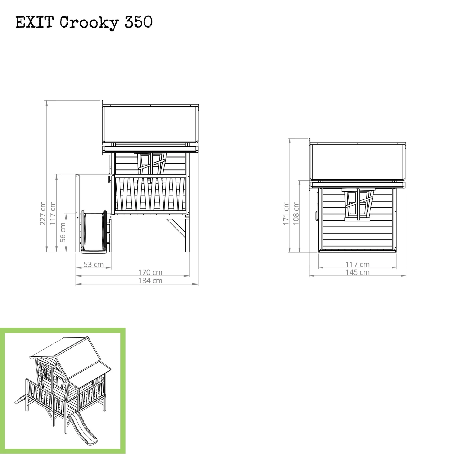 Het EXIT Crooky 350 houten speelhuis in de kleur grijsbeige is een stoere ‘blokhut’ met glijbaan waarin kinderen urenlang speelplezier kunnen beleven. Dit houten speelhuis staat op poten, heeft een veranda en dankzij de vooraf gemonteerde panelen kun je het speelhuis binnen no-time in elkaar zetten. Het EXIT Crooky 350 houten speelhuis met glijbaan heeft een natuurlijke uitstraling en een speels design met onder andere schuine raampjes, een schuin dak en een schuine deur.