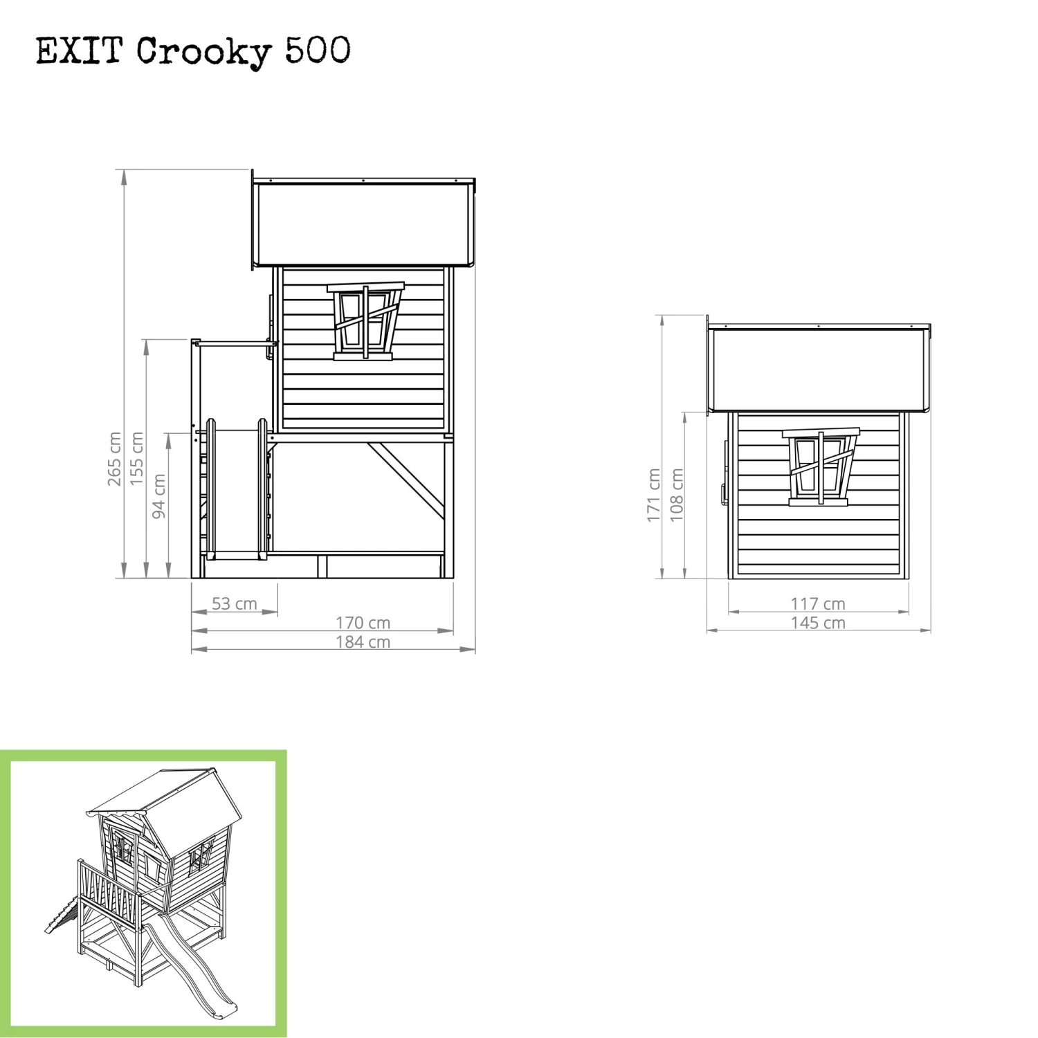 Het EXIT Crooky 500 houten speelhuis in de kleur grijsbeige is een stoere ‘blokhut’ met glijbaan en zandbak waarin kinderen urenlang speelplezier kunnen beleven. Dit houten speelhuis staat op poten en dankzij de vooraf gemonteerde panelen kun je het speelhuis binnen no-time in elkaar zetten. Het EXIT Crooky 500 houten speelhuis met glijbaan en zandbak heeft een natuurlijke uitstraling en een speels design met onder andere schuine raampjes, een schuin dak en een schuine deur.