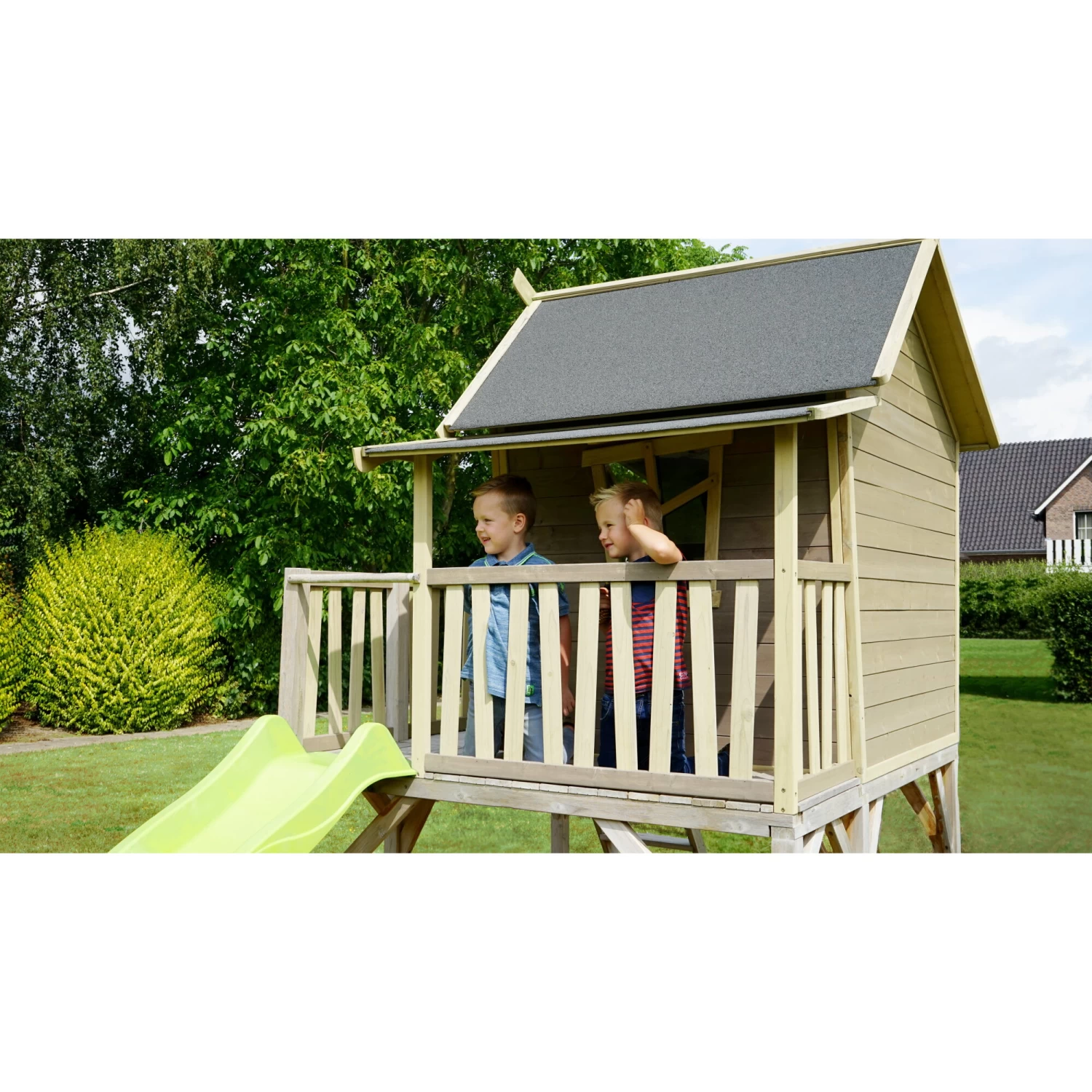Het EXIT Crooky 550 houten speelhuis in de kleur grijsbeige is een stoere ‘blokhut’ met glijbaan en zandbak waarin kinderen urenlang speelplezier kunnen beleven. Dit houten speelhuis staat op poten, heeft een veranda en dankzij de vooraf gemonteerde panelen kun je het speelhuis binnen no-time in elkaar zetten. Het EXIT Crooky 550 houten speelhuis met veranda, glijbaan en zandbak heeft een natuurlijke uitstraling en een speels design met onder andere schuine raampjes, een schuin dak en een schuine deur.