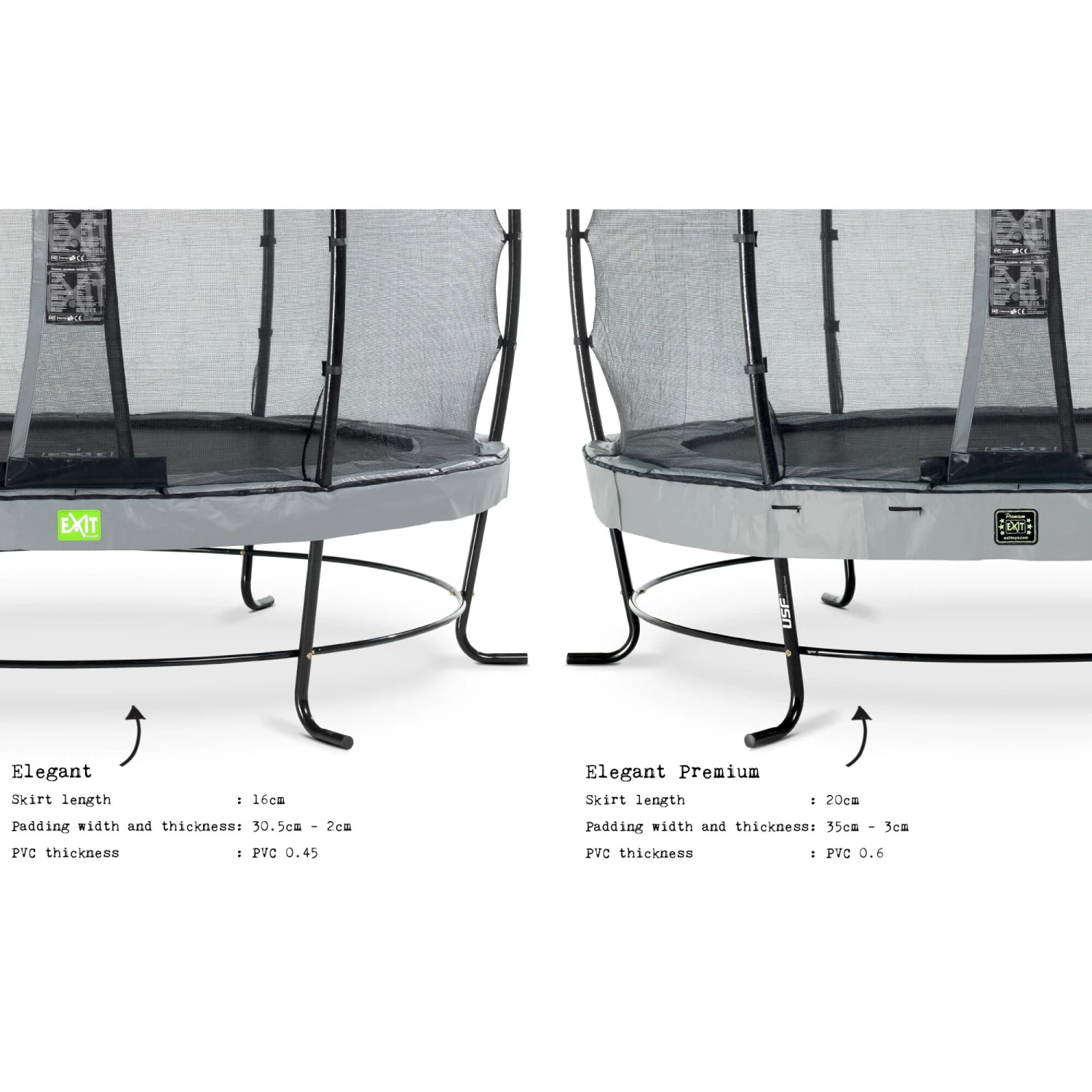 Het frame van de EXIT Elegant trampolines is ijzersterk en daardoor superveilig en stabiel. Dit gepatenteerde frame met zijn unieke L-vormige poten is zo ontworpen dat omvallen of kantelen verleden tijd is. Zelfs bij de hoogste sprongen of onverwachtse capriolen van je kinderen, zal de trampoline altijd stevig op zijn plek blijven staan. Ultimate Stability Frame (USF) noemen we dat bij EXIT Toys! De Elegant bewijst bovendien dat veiligheid en design hand in hand kunnen gaan, want het eigenzinnige ontwerp staat werkelijk prachtig in je tuin.