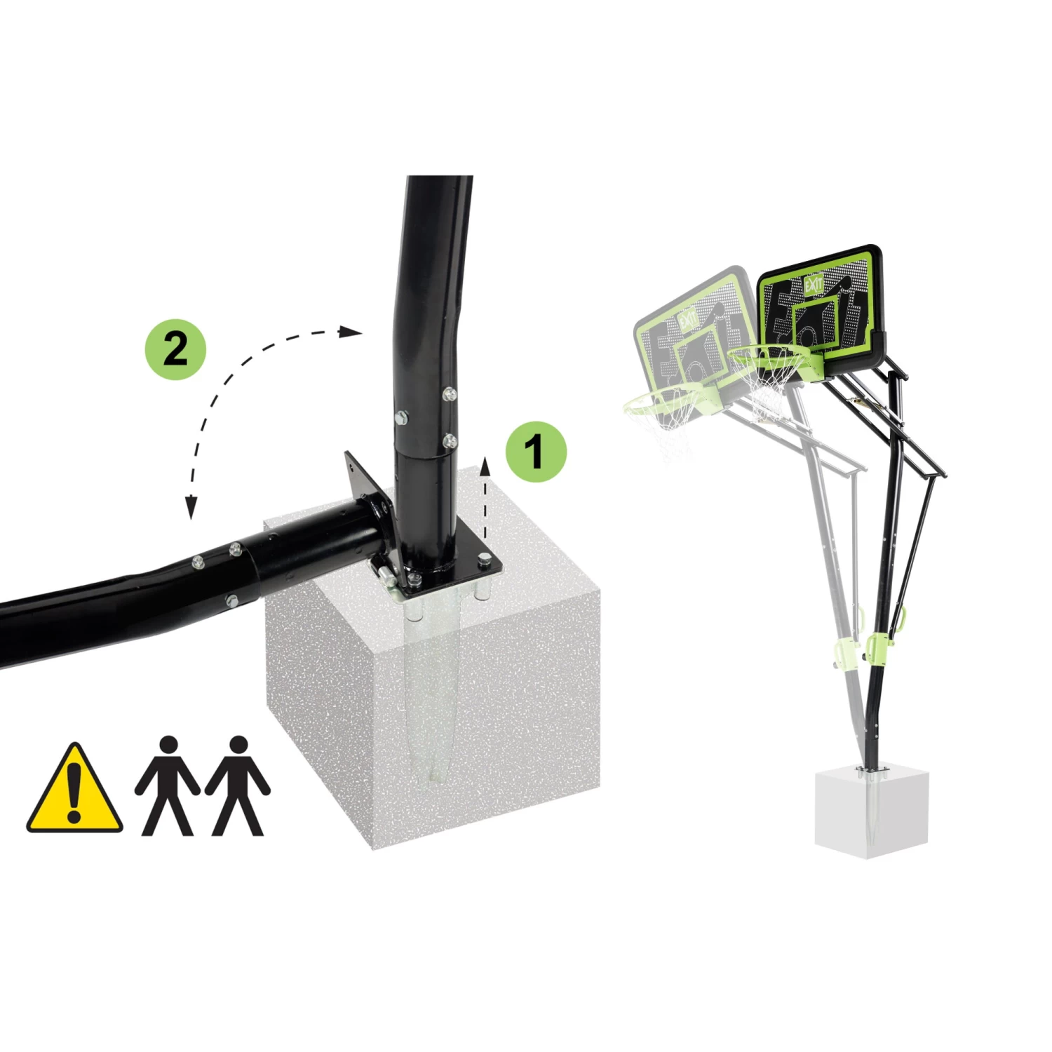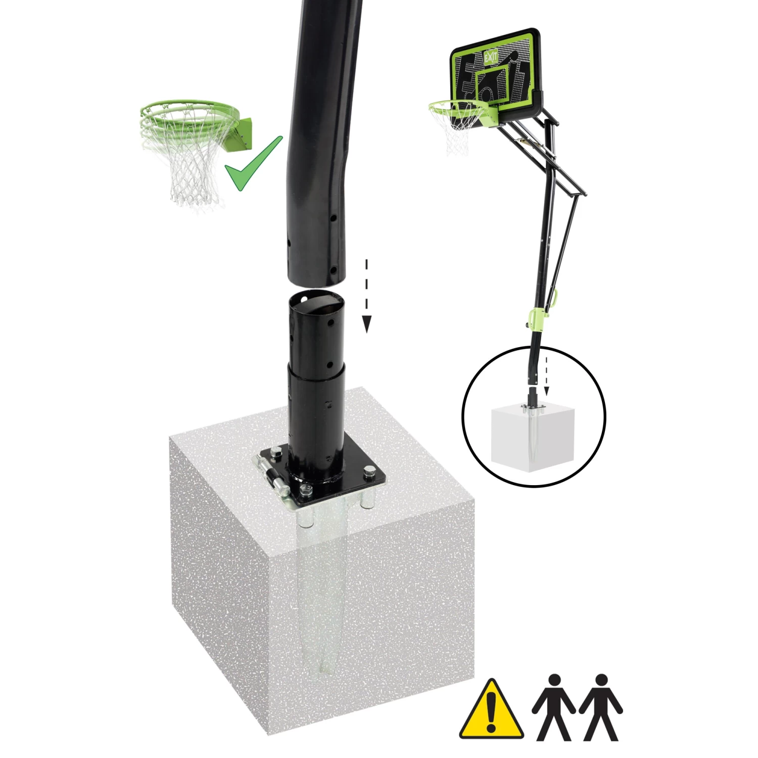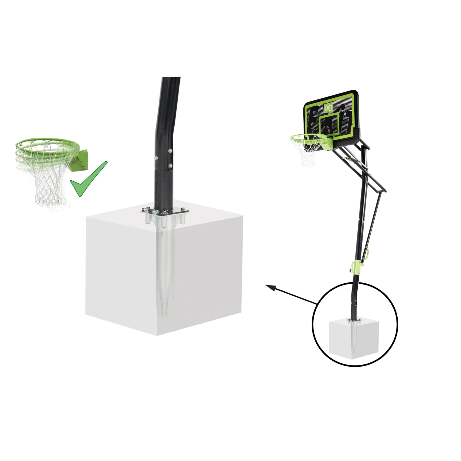 Dit basketbalbord wordt in de grond verankerd, hierdoor kun je het basketbalbord na montage niet meer verplaatsen. Het basketbalbord kan in vijf verschillende standen worden versteld (230 – 245 – 260 – 285 – 305 cm) en de hoogste stand wordt gebruikt bij basketbalwedstrijden voor senioren. De basketbalsystemen van EXIT Toys zijn robuust en gemaakt van hoogwaardige materialen voor een lange levensduur. Train je basketbal skills met de EXIT Galaxy basketbalsystemen!