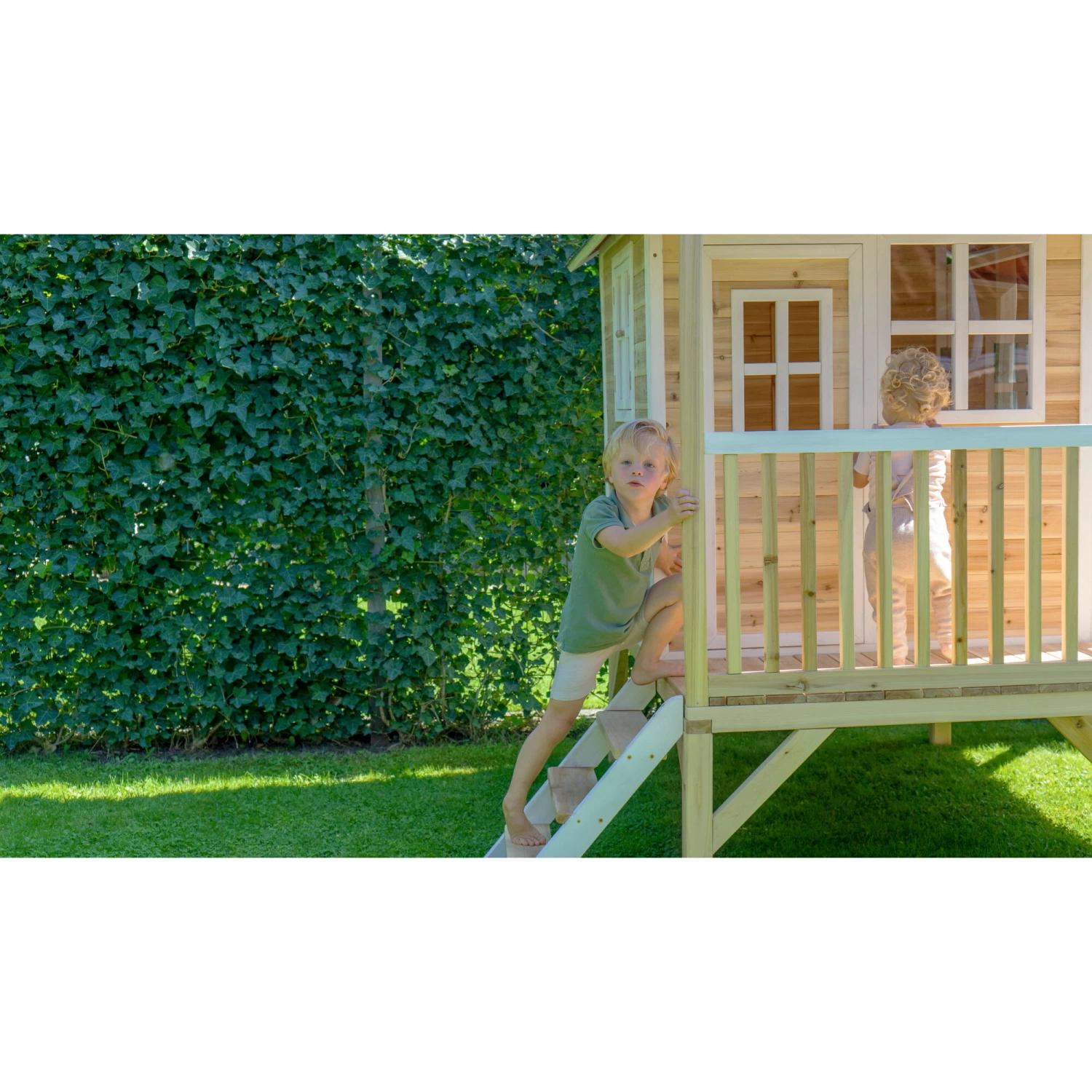 In het EXIT Loft 300 houten speelhuis in de kleur naturel hoeven de kinderen zich geen dag te vervelen. Dit houten speelhuisje staat op poten en heeft een trapje en een glijbaan die zowel links als rechts aan het speelhuis kunnen worden bevestigd. De speelhuisjes zijn eenvoudig in elkaar te zetten vanwege de vooraf gemonteerde onderdelen. Typerend voor het EXIT Loft 300 houten speelhuis is het strakke Scandinavische design met mooie witte kozijnen. Dit speelhuisje met leuke glijbaan zal zeker niet misstaan in de tuin!