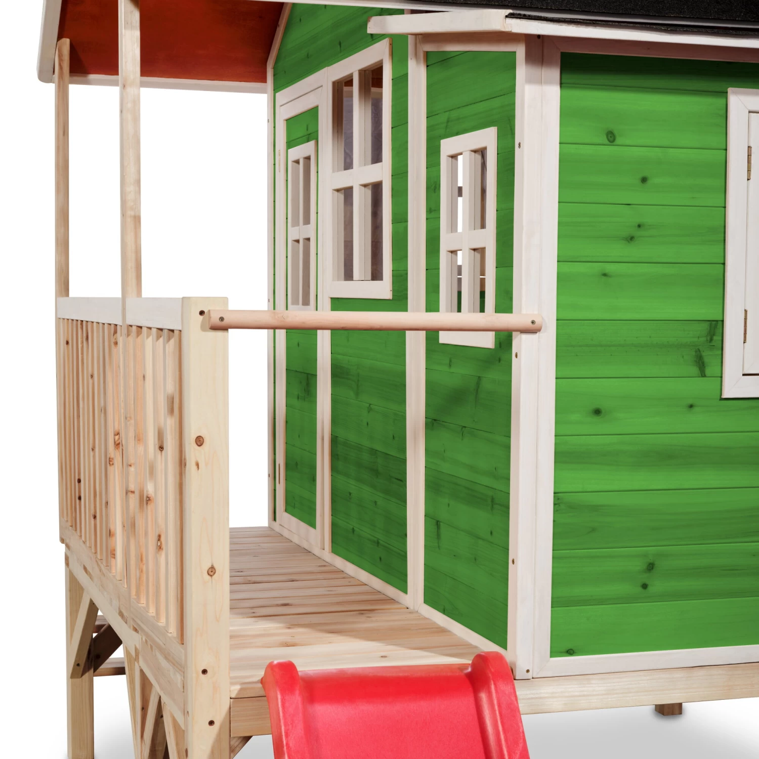 In het EXIT Loft 350 houten speelhuis in de kleur groen hoeven de kinderen zich geen dag te vervelen. Dit houten speelhuisje staat op poten en heeft een aanbouw, trappetje en een leuke glijbaan. De speelhuisjes zijn eenvoudig in elkaar te zetten vanwege de vooraf gemonteerde onderdelen. Typerend voor het EXIT Loft 350 houten speelhuis is het strakke Scandinavische design met mooie witte kozijnen. Dit speelhuisje met leuke glijbaan zal zeker niet misstaan in de tuin!