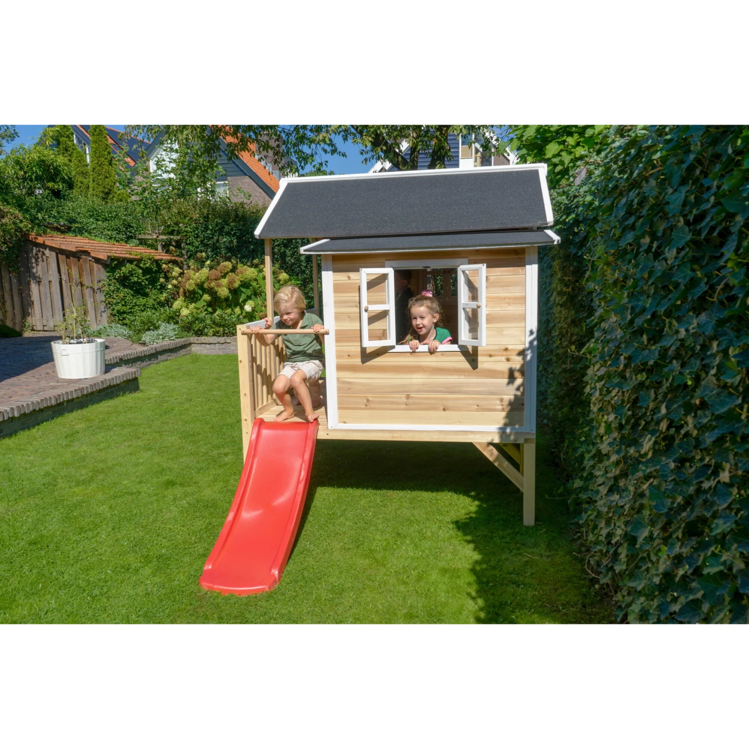 In het EXIT Loft 350 houten speelhuis in de kleur naturel hoeven de kinderen zich geen dag te vervelen. Dit houten speelhuisje staat op poten en heeft een aanbouw, trappetje en een leuke glijbaan. De speelhuisjes zijn eenvoudig in elkaar te zetten vanwege de vooraf gemonteerde onderdelen. Typerend voor het EXIT Loft 350 houten speelhuis is het strakke Scandinavische design met mooie witte kozijnen. Dit speelhuisje met leuke glijbaan zal zeker niet misstaan in de tuin!
