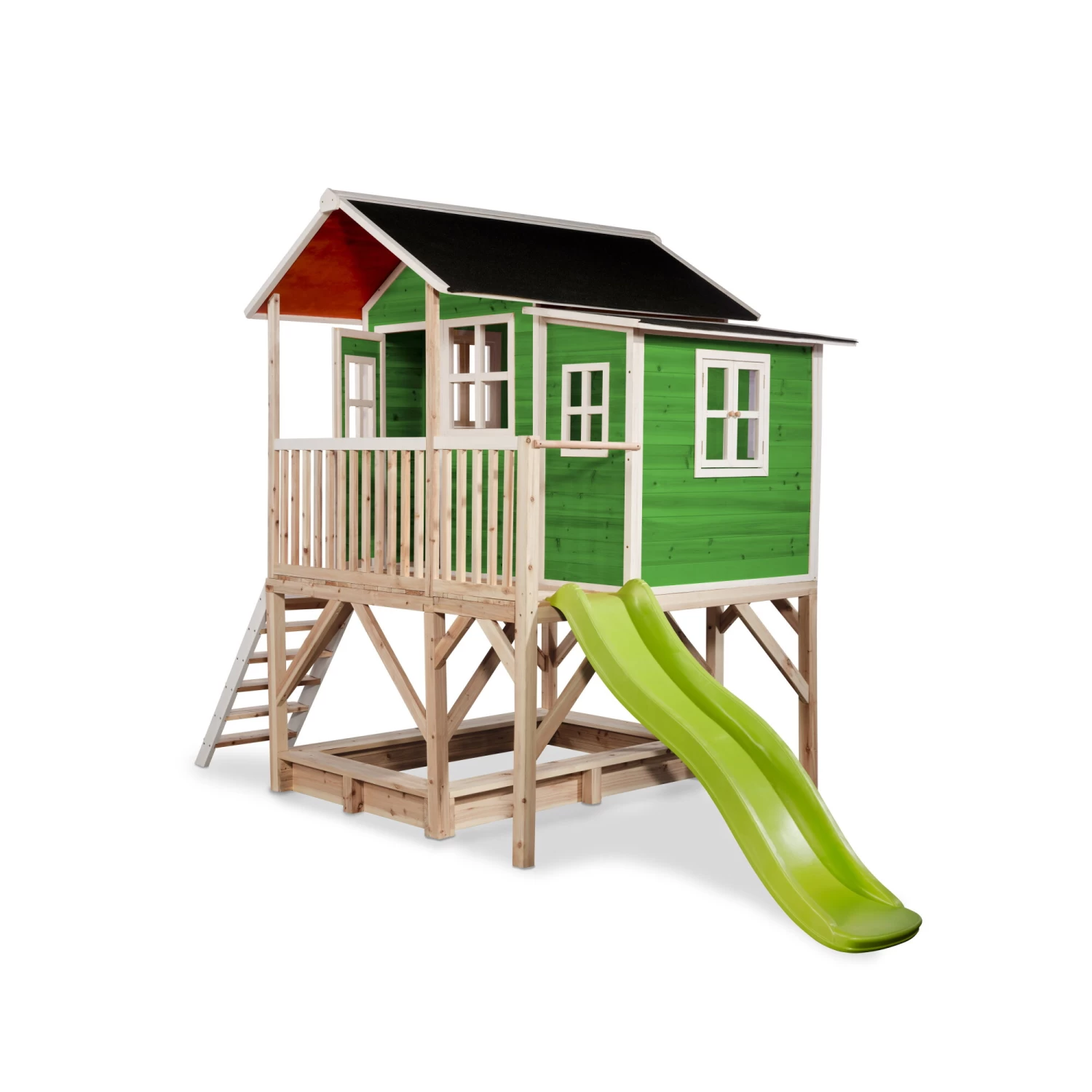 In het EXIT Loft 550 houten speelhuis in de kleur groen hoeven de kinderen zich geen dag te vervelen. Dit speelhuisje op poten heeft een aanbouw en is extra verhoogd, zodat kinderen in de zandbak eronder kunnen spelen. Klim eenvoudig omhoog via het trappetje en glij naar beneden via de coole glijbaan. De speelhuisjes zijn eenvoudig in elkaar te zetten vanwege de vooraf gemonteerde onderdelen. Typerend voor het EXIT Loft 550 houten speelhuis is het strakke Scandinavische design met mooie witte kozijnen. Dit speelhuisje met glijbaan en zandbak zal zeker niet misstaan in de tuin!