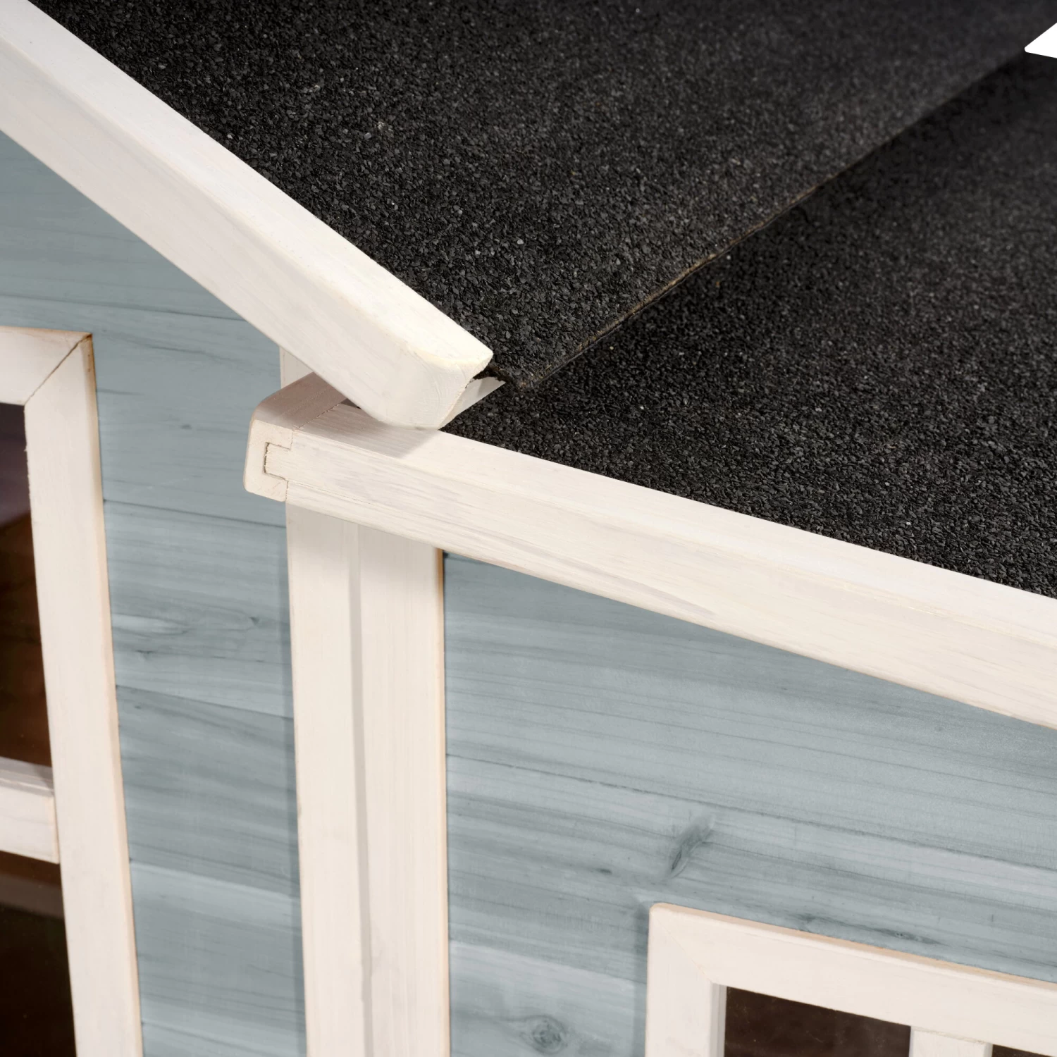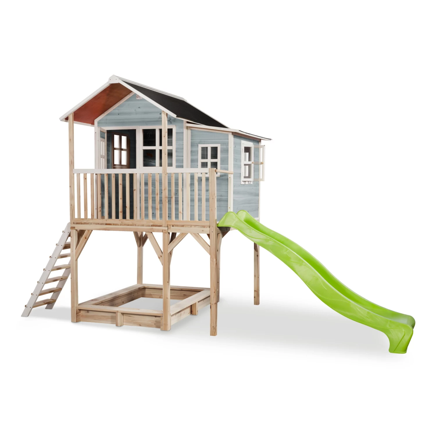 In het EXIT Loft 750 houten speelhuis in de kleur blauw hoeven de kinderen zich geen dag te vervelen. Dit speelhuisje staat op een extra hoog plateau en heeft een aanbouw en een lange glijbaan. Door het hogere frame kunnen kinderen van alle leeftijden ook in de zandbak eronder spelen. Klim eenvoudig omhoog via het trappetje en glij naar beneden via de coole glijbaan. De speelhuisjes zijn eenvoudig in elkaar te zetten vanwege de vooraf gemonteerde onderdelen. Typerend voor het EXIT Loft 750 houten speelhuis is het strakke Scandinavische design met mooie witte kozijnen. Dit speelhuisje met glijbaan en zandbak zal zeker niet misstaan in de tuin!Â