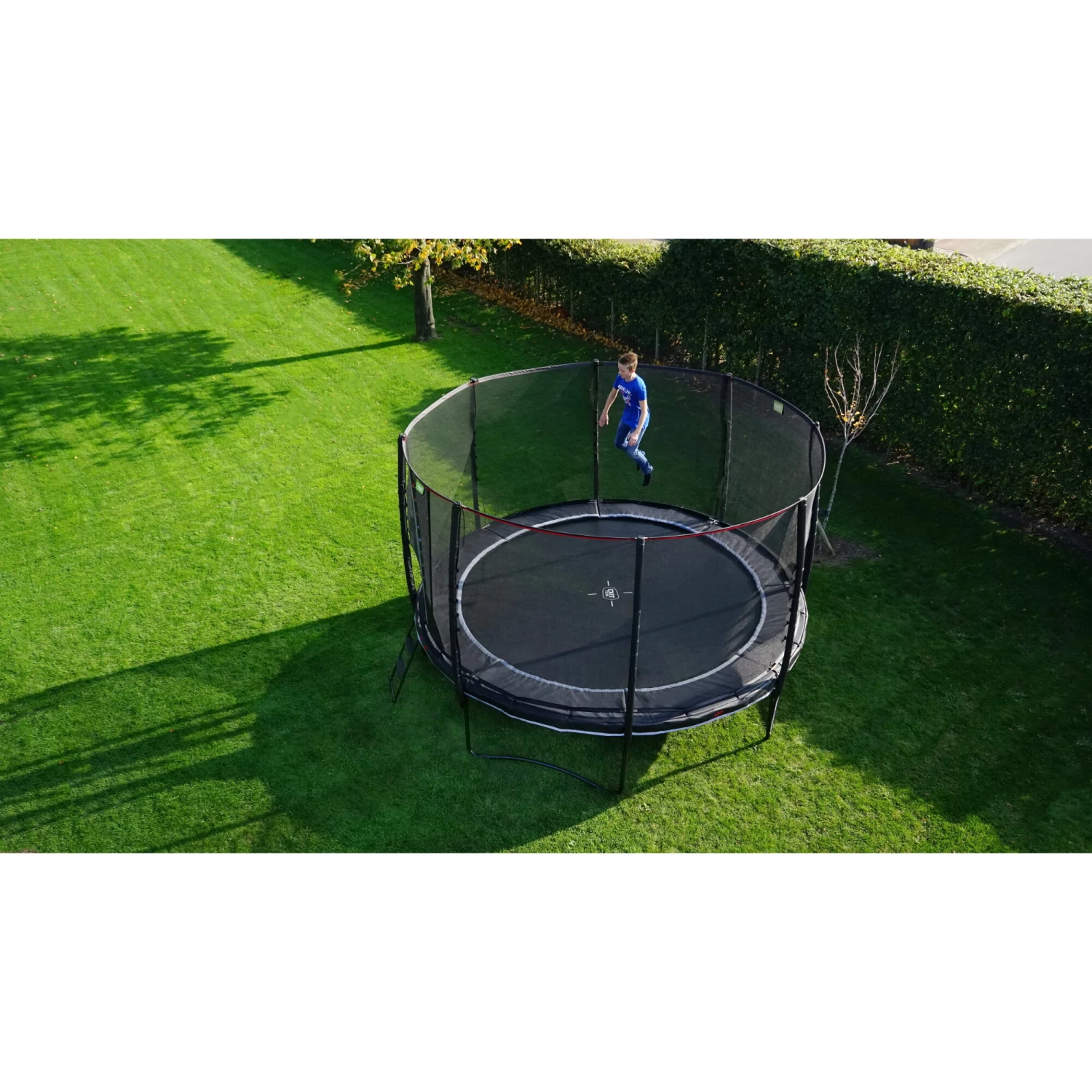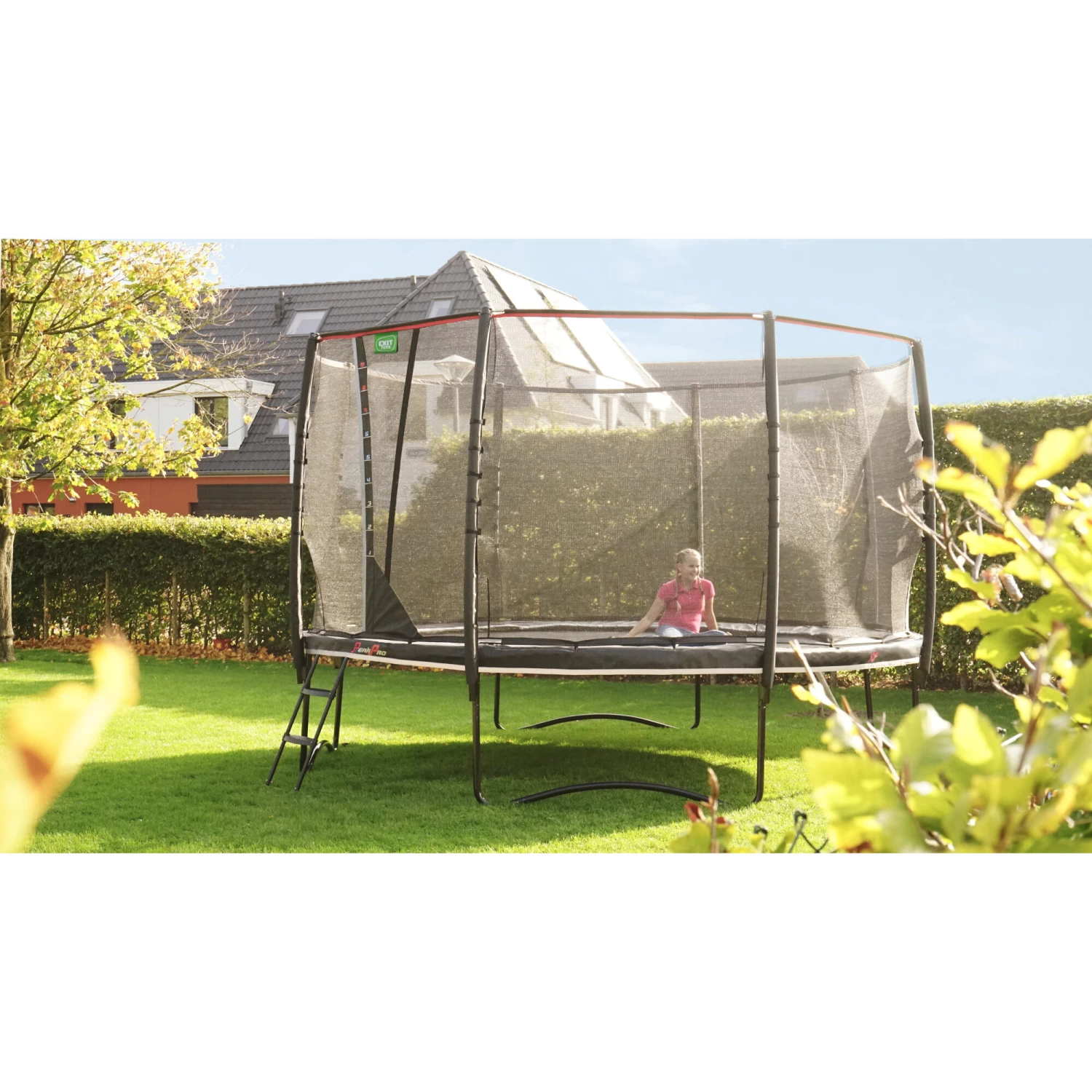 De EXIT PeakPro trampoline met veiligheidsnet is een ronde trampoline met een matzwarte beschermrand en eersteklas springcomfort. De grote trampoline heeft een robuuste uitstraling door het zwarte frame, de subtiele kleurdetails en reflecterende bies: een pronkstuk in iedere tuin. Bij deze trampoline wordt een trampolineladder meegeleverd zodat je veilig en snel op de trampoline klimt. Met de PeakPro trampoline in de tuin staan kinderen te springen om hun kunsten te laten zien.