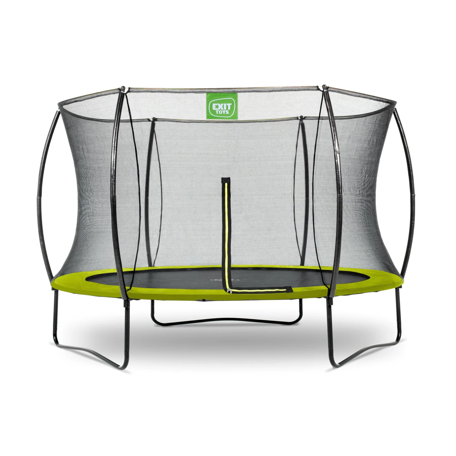 De EXIT Silhouette trampoline op poten is een ronde trampoline met een limoengroene beschermrand. Het veiligheidsnet, dat standaard wordt meegeleverd met de trampoline op poten, is voorzien van gebogen staanders zodat het net strakgespannen staat. Dit is niet alleen extra veilig omdat kinderen niet in het net kunnen blijven hangen, maar het oogt ook rustiger in de tuin. Het veiligheidsnet is voorzien van een fluorescerende groene ritssluiting die goed opvalt, zodat je direct kunt zien of de rits goed is gesloten.