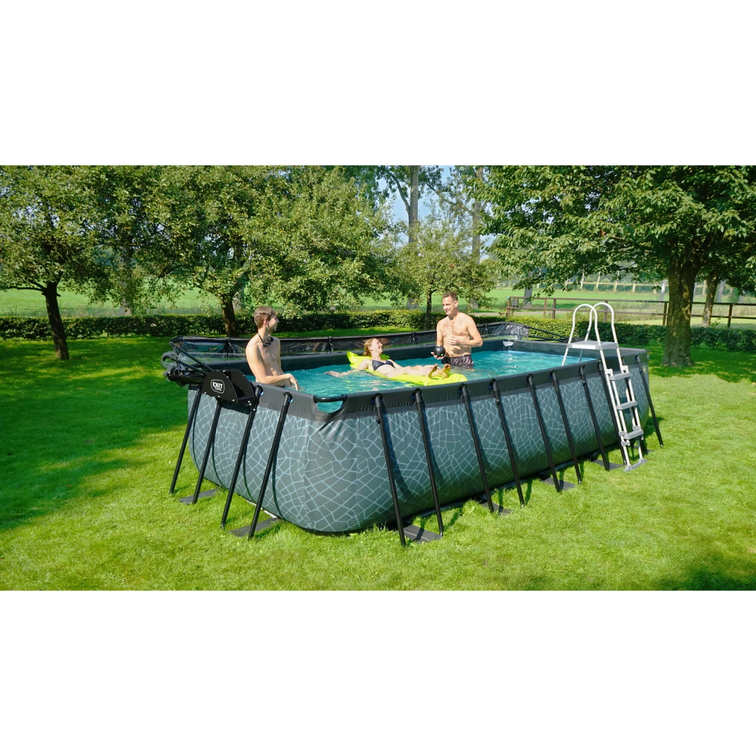Het EXIT Stone zwembad 540 x 250 x 122 cm is een rechthoekig grijskleurig frame zwembad met overkapping. Dit grote zwembad is standaard voorzien van een zandfilterpomp en een zwembadtrap, waarmee je veilig het zwembad in en uit kunt stappen. Het frame zwembad biedt genoeg ruimte om heerlijk op een luchtbed te dobberen. En wil je toch liever onder water zwemmen? Het EXIT Stone zwembad is maar liefst 122 centimeter diep waardoor je echt onder water kunt duiken. De frame zwembaden met overkapping van EXIT Toys zijn multifunctioneel, duurzaam en dé perfecte oplossing voor wisselvallig zomerweer!