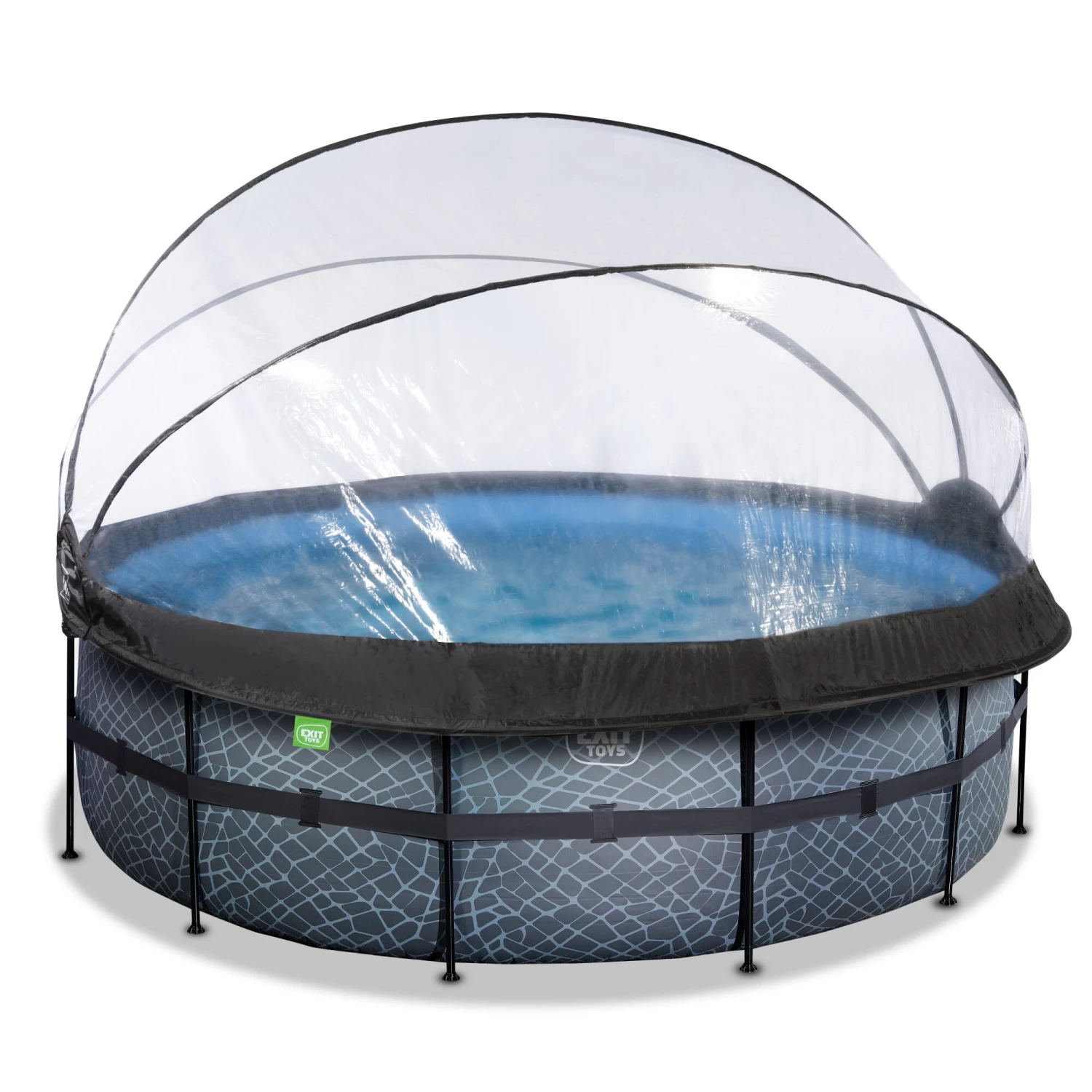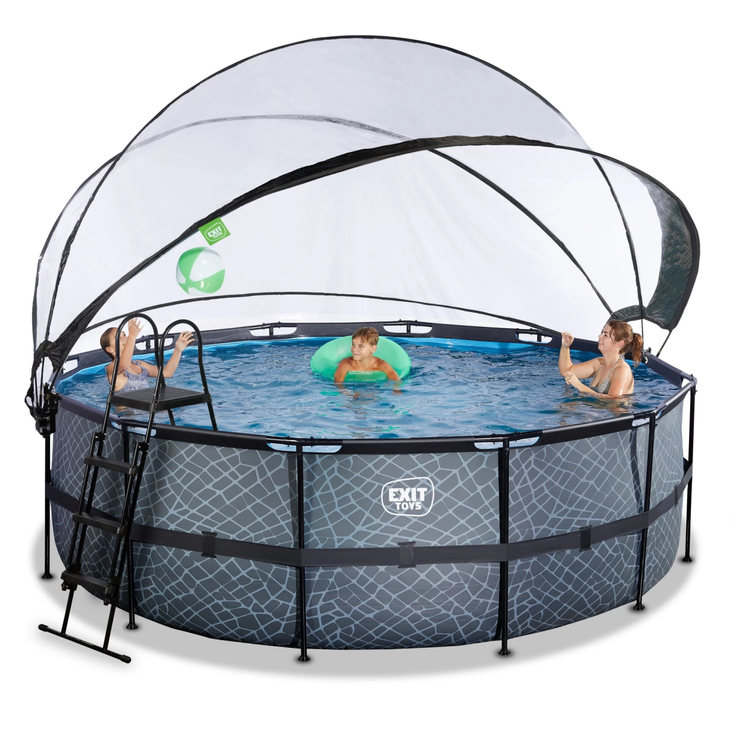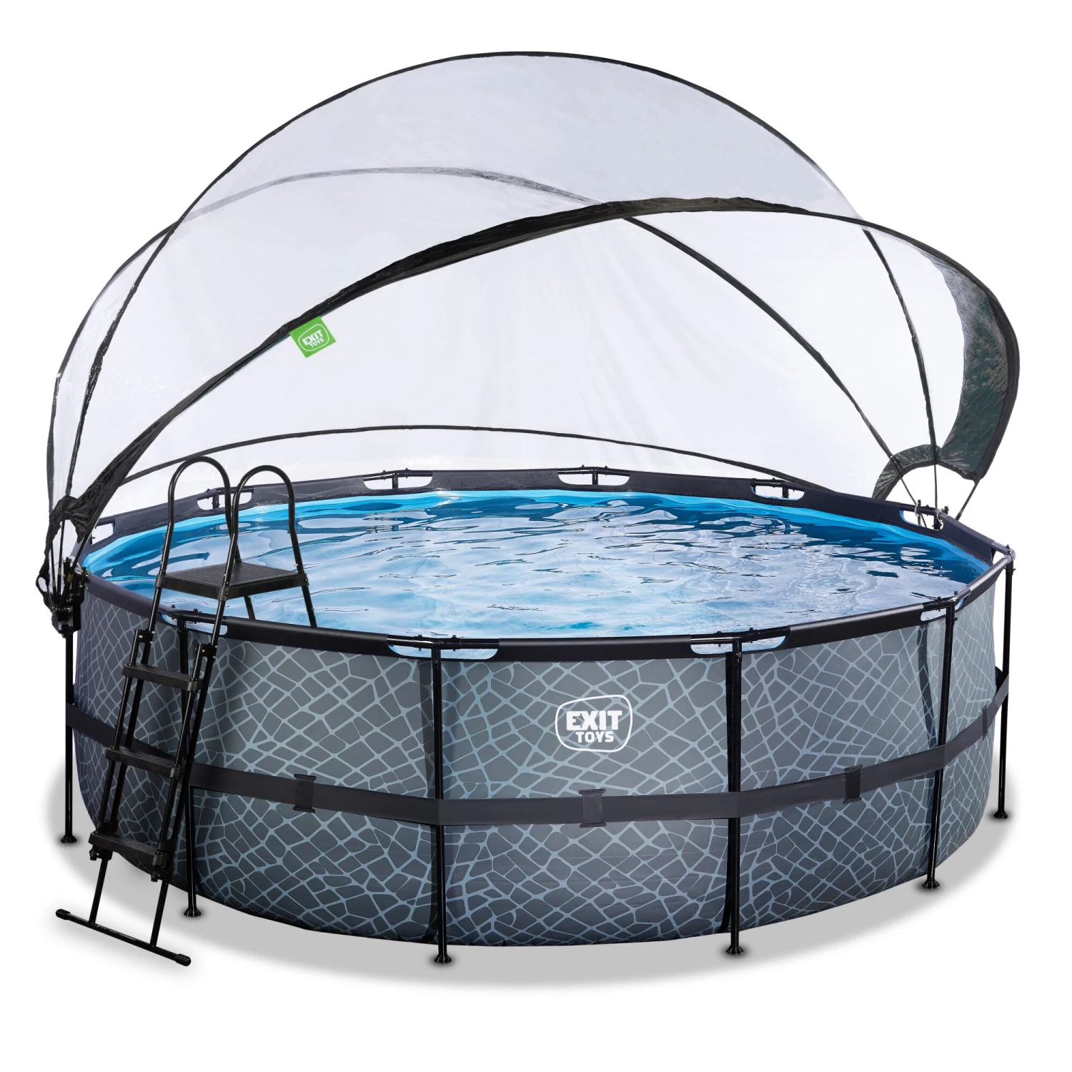 Het EXIT Stone zwembad ø427 x 122 cm is een rond, grijskleurig frame zwembad met overkapping. Het zwembad is standaard voorzien van een zandfilterpomp, warmtepomp en een zwembadtrap, waarmee je veilig het zwembad in en uit kunt stappen. Door de grote diameter van het zwembad is er genoeg ruimte om heerlijk op een luchtbed te dobberen. En wil je toch liever onder water zwemmen? Het EXIT Stone zwembad is maar liefst 122 centimeter diep waardoor je echt onder water kunt duiken. Met het hoogwaardige frame zwembad van EXIT Toys beleef je gegarandeerd de leukste wateravonturen in je eigen tuin!