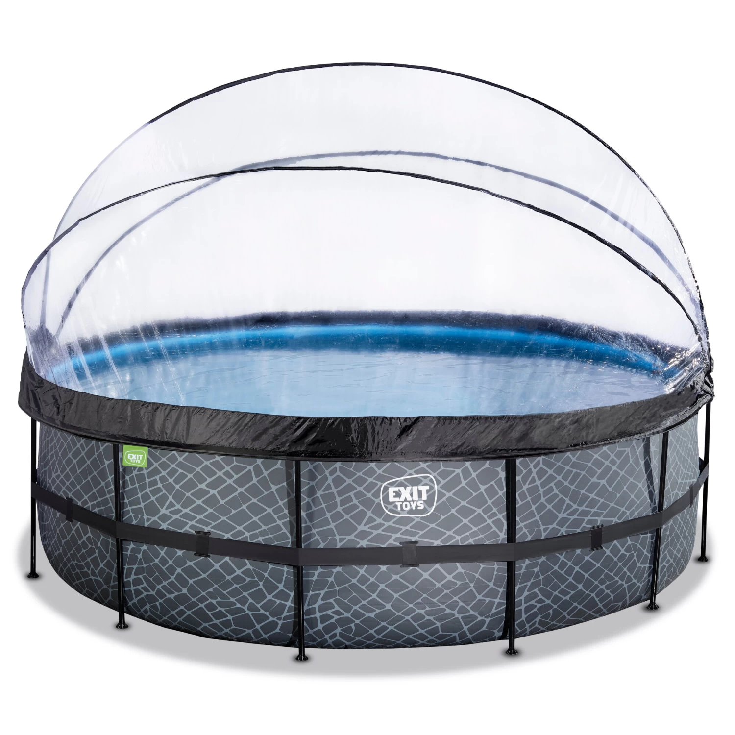 Het EXIT Stone zwembad ø450 x 122 cm is een rond grijskleurig frame zwembad met overkapping. Het zwembad is standaard voorzien van een zandfilterpomp, warmtepomp en een zwembadtrap, waarmee je veilig het zwembad in en uit kunt stappen. Door de royale diameter van het zwembad is er genoeg ruimte om heerlijk op een luchtbed te dobberen. En wil je toch liever onder water zwemmen? Het EXIT Stone zwembad is maar liefst 122 centimeter diep waardoor je echt onder water kunt duiken. Met het hoogwaardige frame zwembad van EXIT Toys beleef je gegarandeerd de leukste wateravonturen in je eigen tuin!