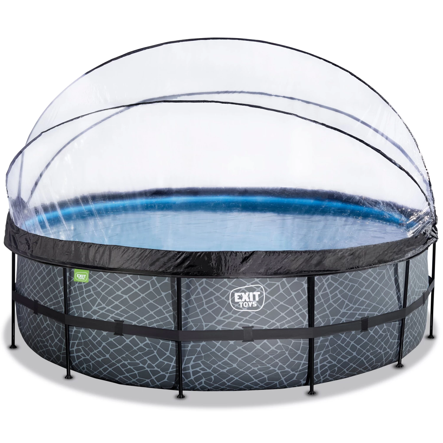 Het EXIT Stone zwembad ø488 x 122 cm is een rond grijskleurig frame zwembad met overkapping. Het zwembad is standaard voorzien van een zandfilterpomp, warmtepomp en een zwembadtrap, waarmee je veilig het zwembad in en uit kunt stappen. Door de zeer royale diameter en een diepte van maar liefst 122 centimeter beleef je in het zwembad van EXIT Toys een zomerlang zwemplezier met familie en vrienden.