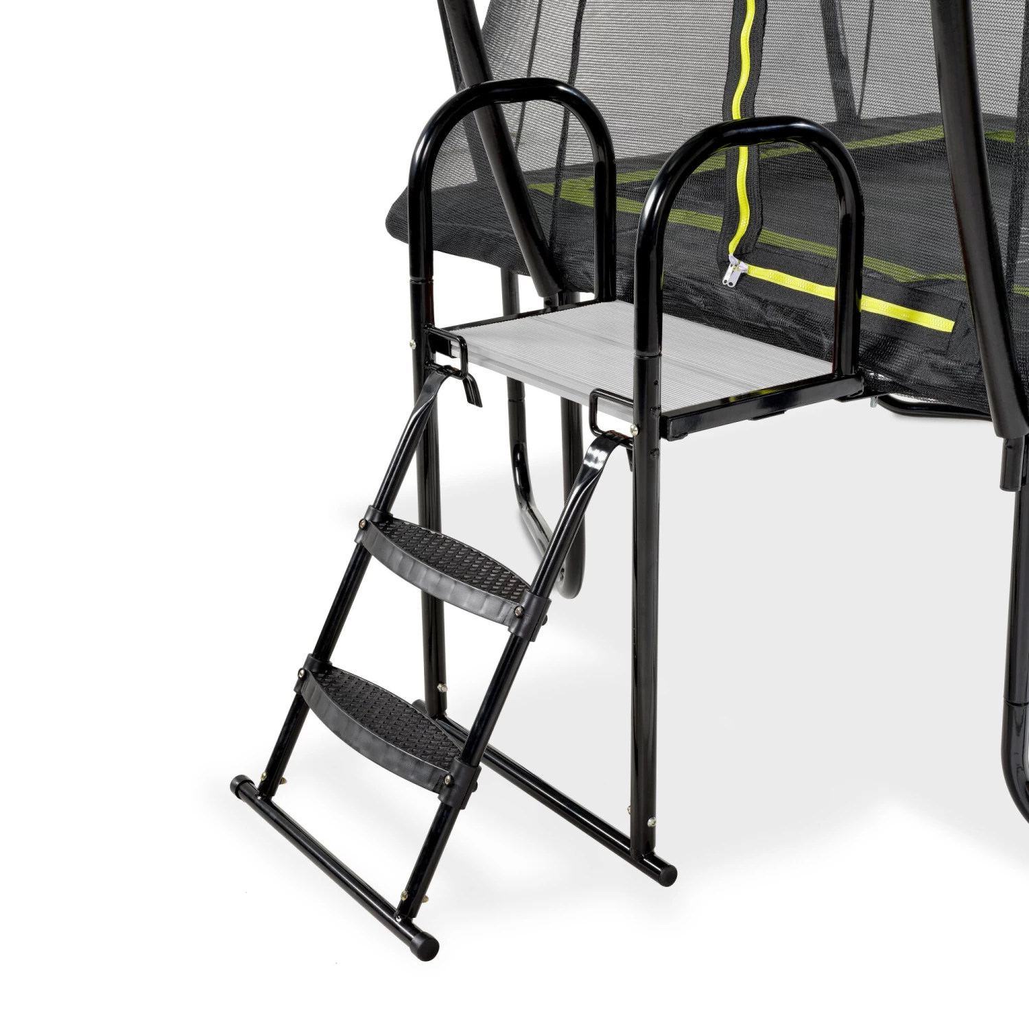 Het platform en de ladder hebben brede treden met anti-slip structuur, waar kinderen goed op kunnen staan voor ze door het veiligheidsnet klimmen. Voor extra veiligheid en houvast is het platform aan de zijkanten voorzien van beugels. Deze combinatie van platform ladder is geschikt voor EXIT trampolines met een diameter van 183 en 244 centimeter.