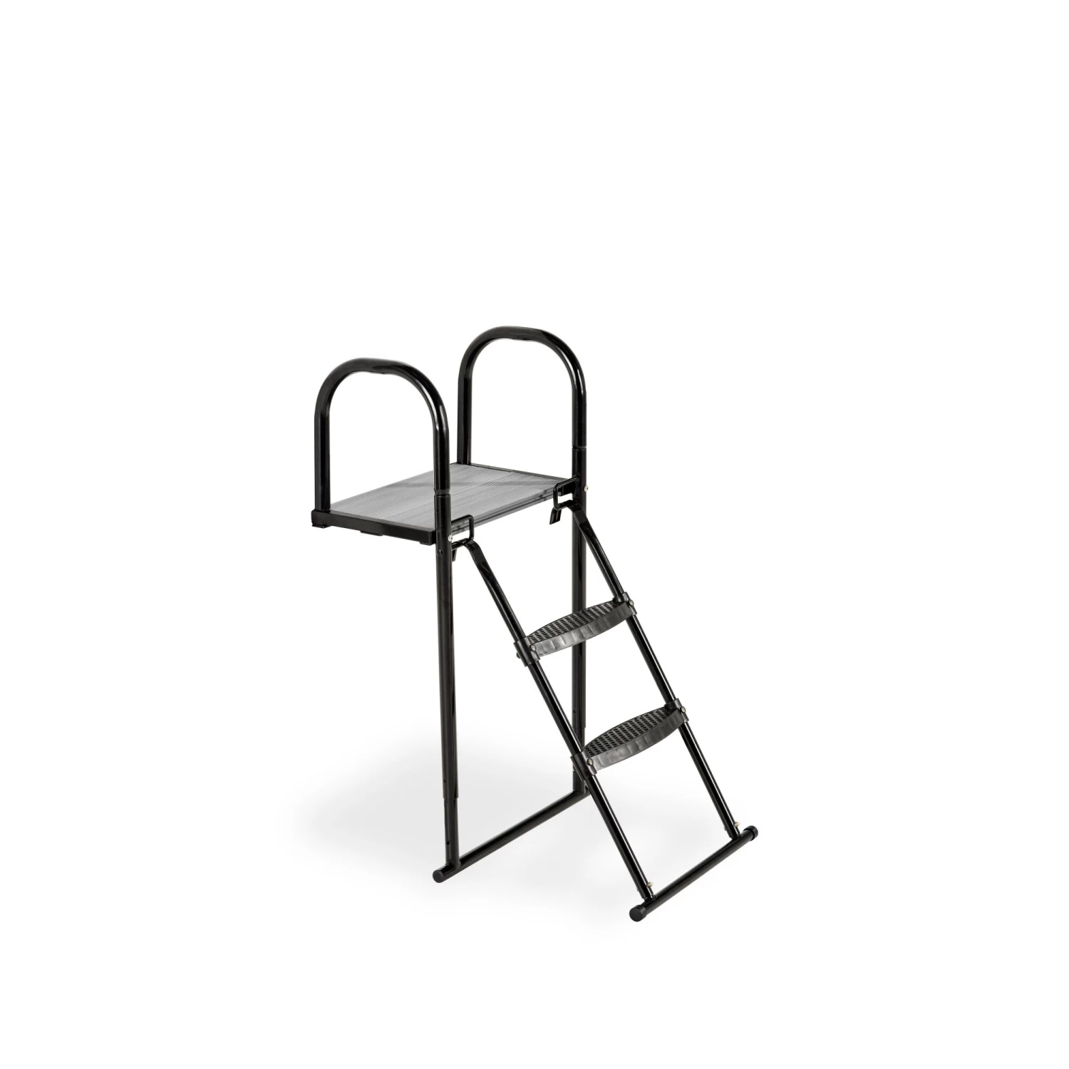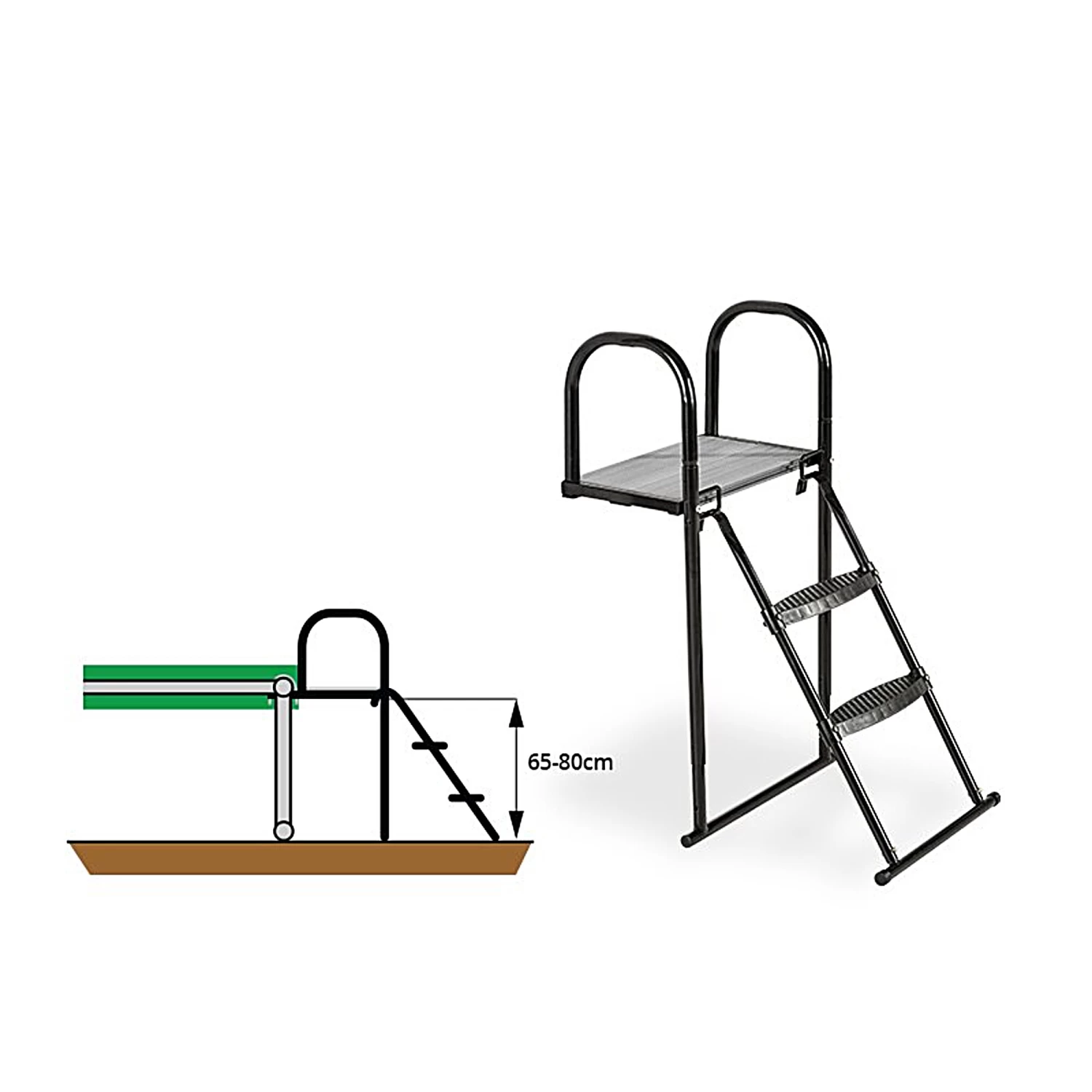 Het EXIT trampoline platform met een trampoline ladder voor framehoogtes tussen de 65 en 80 centimeter is een uitstekend hulpmiddel om op veilige wijze op een trampoline op poten te klimmen. Het platform wordt aan de trampoline bevestigd en de ladder hang je aan het platform, waardoor een prettige opstap naar de trampoline ontstaat.