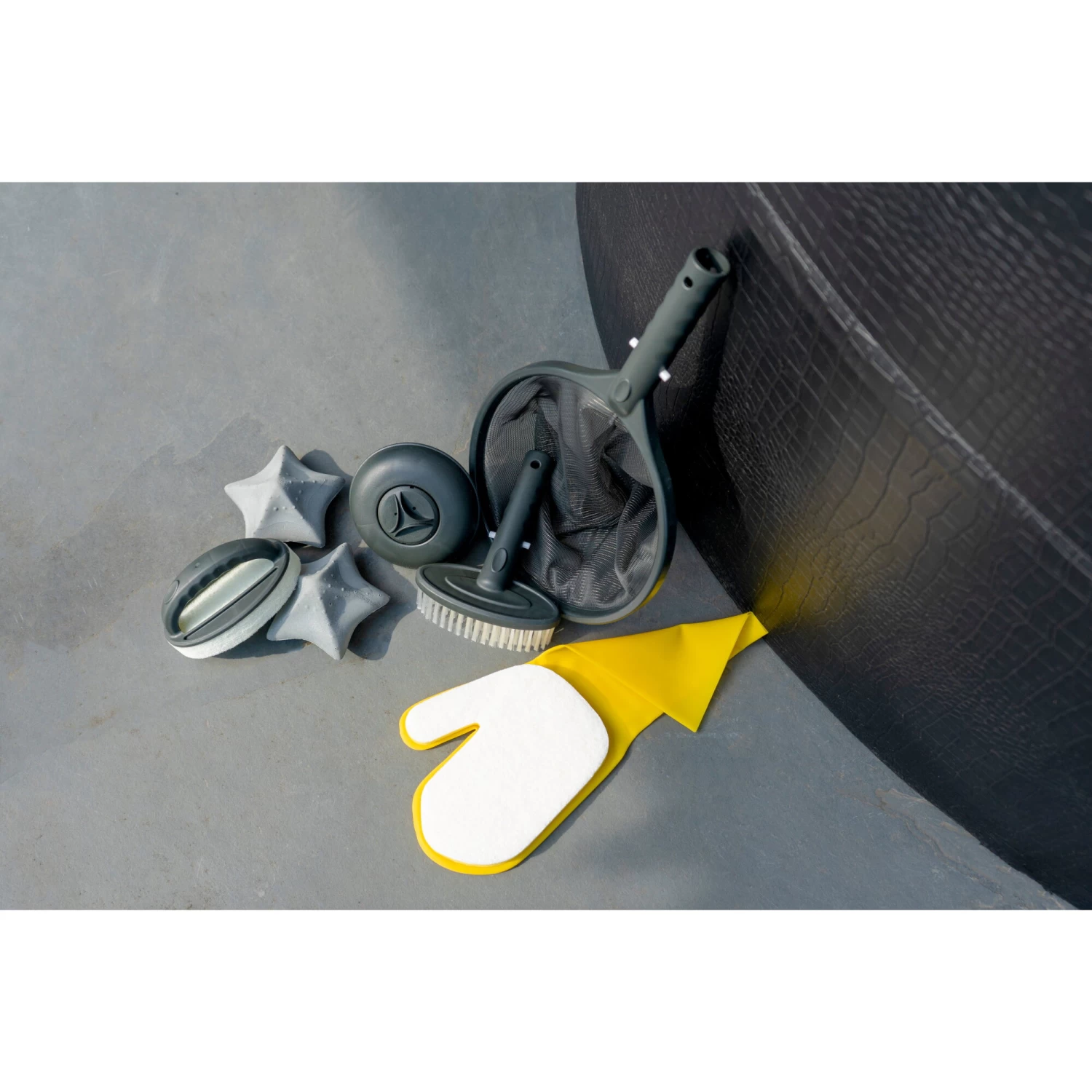De spa schoonmaakset bevat de perfecte hulpmiddelen voor het schoonmaken van een spa. Deze set bestaat uit een handschoen met spons, borstel, schepnet, twee schoonmaaksponsen en een chloordrijver. Met deze schoonmaakset hou je de spa fris en schoon en voorkom je dat algen en bacteriën zich nestelen in het water.